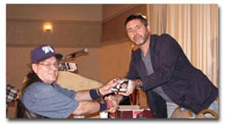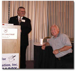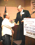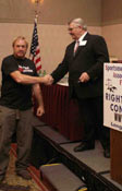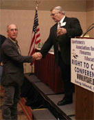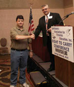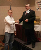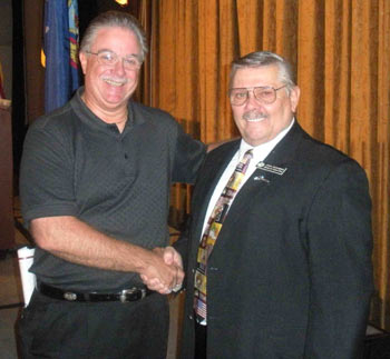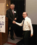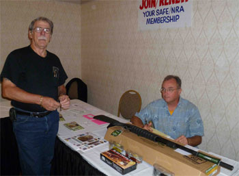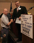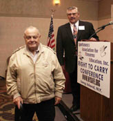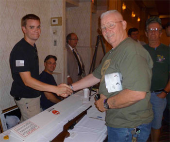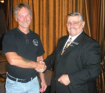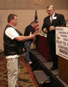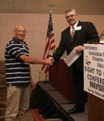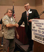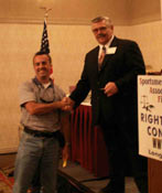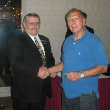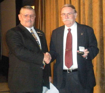 John Cushman, holding a key chain with a medallion commemorating the 100th anniversary of the 1911-2011 and an inscription on the back thanking him for all his work for the sportsmen, Mr. Ed Kapshak SAFE member and donor of the key chain, and Bill Raab