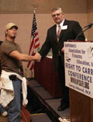 John Cushman and Ed Kapshak, owner of AG Fox Jewelry store and donor of a silver pin, present it to Brian Anderson owner of Guns & Ammo Gun store on Sunrise Highway in Sayville as Bill Raab looks on